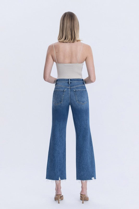 COMFORT STRETCH DENIM, HIGH RISE WAIST, 5 POCKETS, RAW HEM, ANKLE LENGTH, MEDIUM DARK WASH, WIDE LEG JEANS