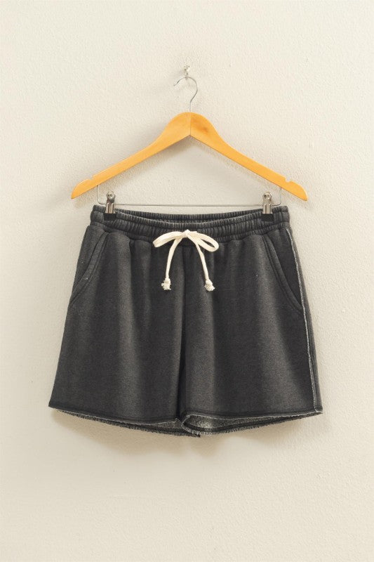 These shorts are crafted from soft burnout french terry and features a comfortable high-rise elastic waistband with a functional drawstring and deep side seam pockets. The cut is a relaxed, mid-thigh fit with exposed seams and a raw-edge hemline. Pair with a matching cropped sweatshirt and sneakers for a stylish loungewear look.