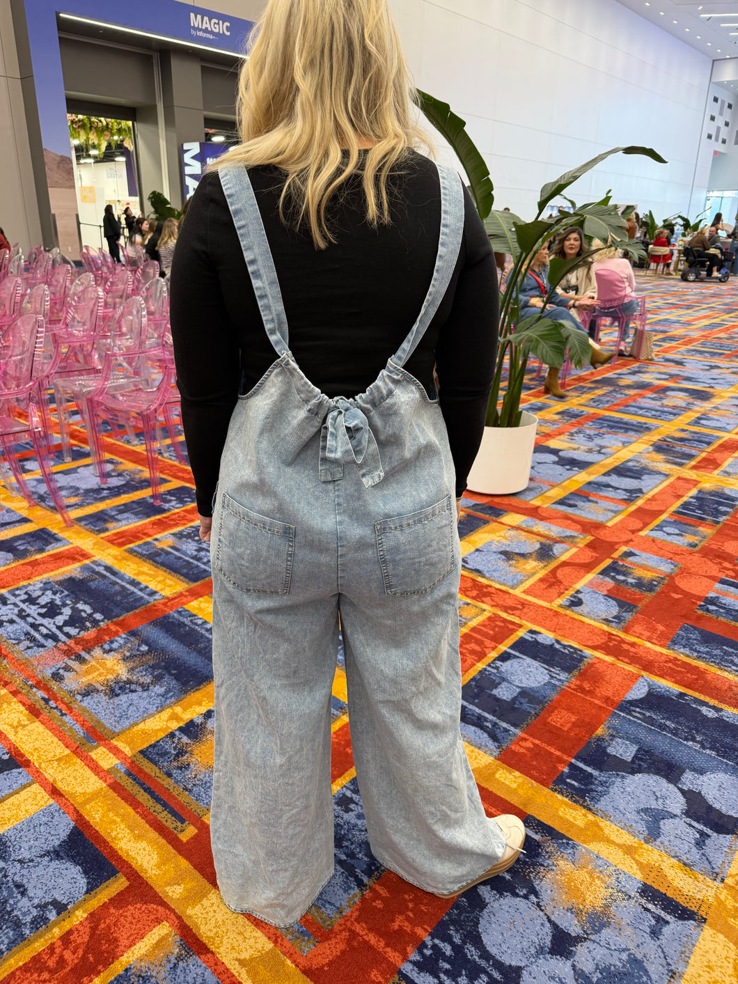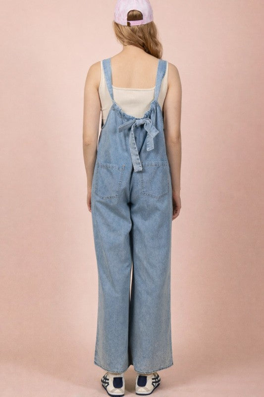 Effortless style meets comfort in this washed chambray jumpsuit. The sleeveless design keeps things cool and breezy, while practical side and back pockets add functionality to your everyday look. A charming back tie detail cinches the silhouette for a flattering fit. Perfect for casual outings, weekend brunches, or laid-back adventures—throw it on and go.