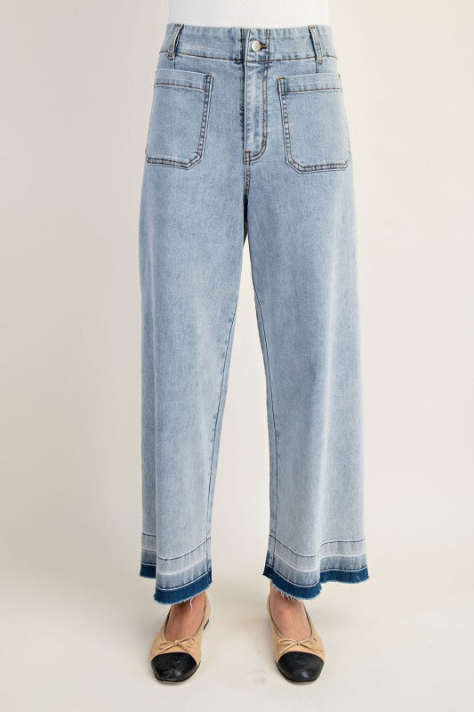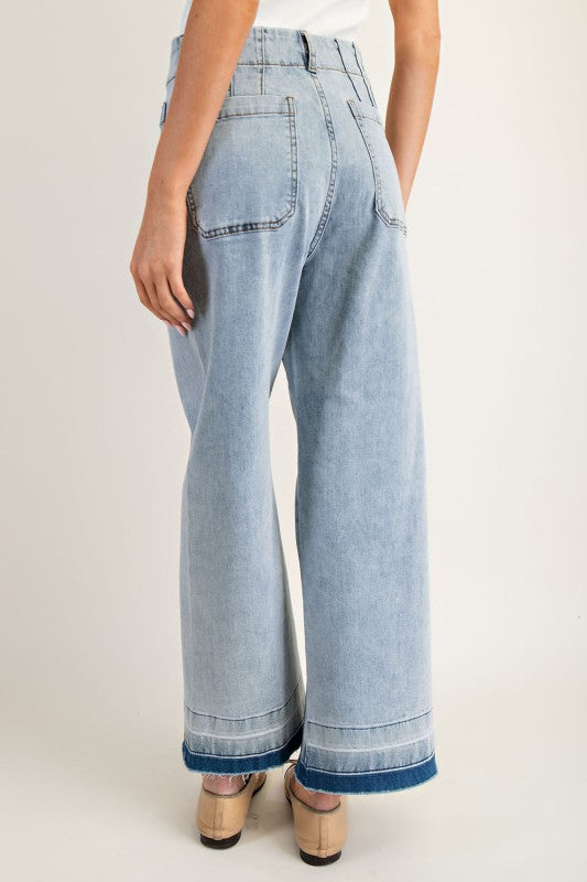 Mineral washed denim pants featuring a straight leg style, a button and zipper closure, belt loops, two open front pockets, two back pockets and a raw bottom hem.