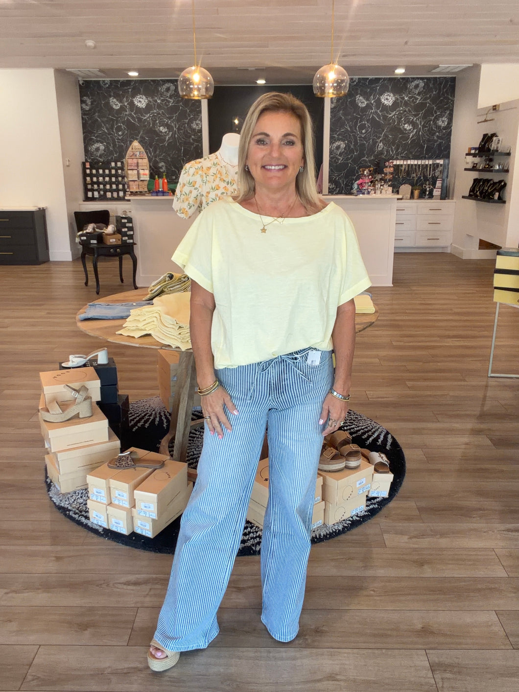 HIGH RISE WAIST TIE STRIPED WIDE LEG JEANS COMFORT STRETCH DENIM, HIGH RISE WAIST, 5 POCKETS, WAIST TIE, FINISHED HEM, FULL LENGTH, STRIPED WIDE LEG JEANS F. RISE: 10" / INSEAM: 32" / LEG OPENING: 23 1/2" MODEL IS 5'10" WEARING A SIZE 26
