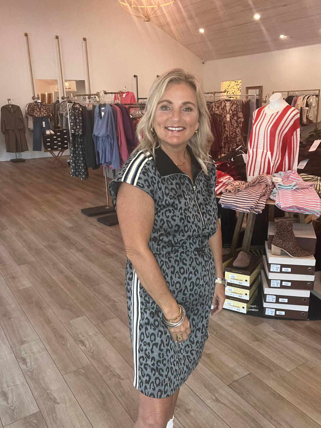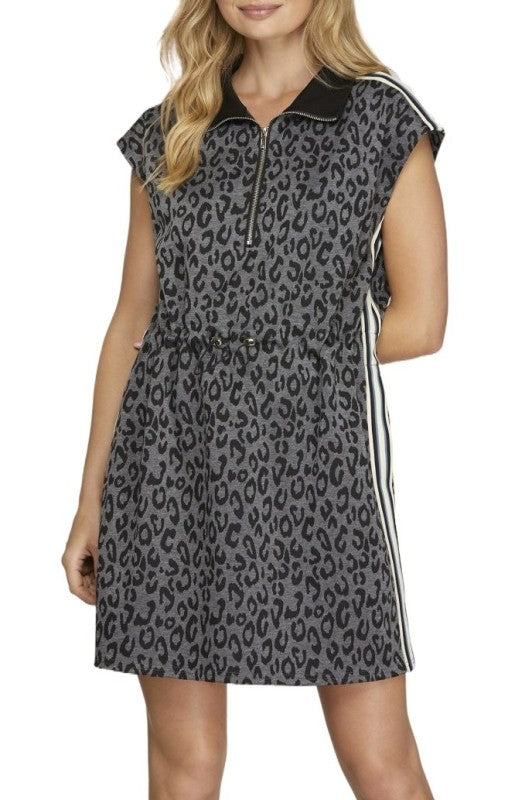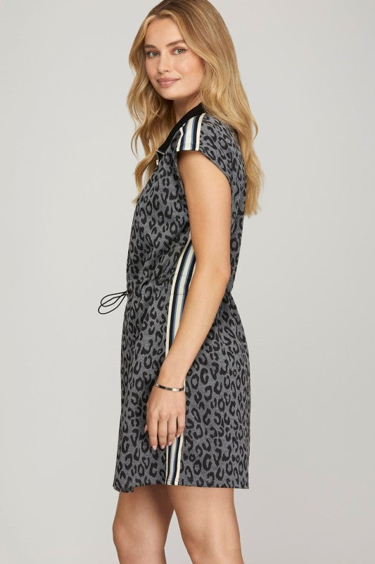 This adorable short sleeve knit mini dress features a playful leopard print with a trendy half zip and a contrasting band for a fun, sporty touch. The drawstring elastic waist band lets you adjust the fit while adding a flattering shape. Perfect for casual days when you want to look effortlessly cute and stylish.