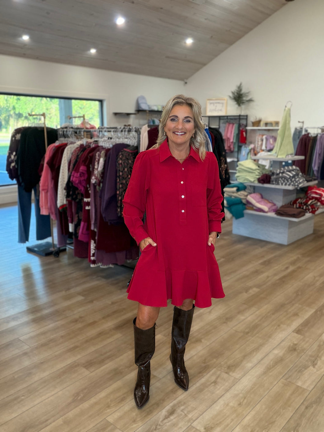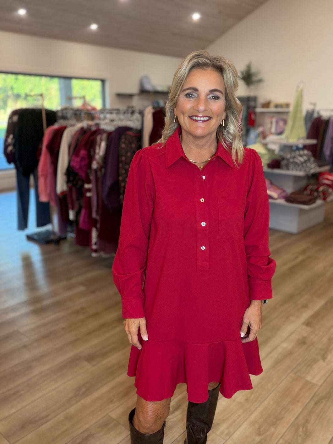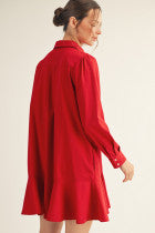 This charming long-sleeve button-down shift dress adds a playful twist to your wardrobe with its flirty ruffle hem. Designed for effortless style, it features handy side pockets and a cute chest pocket, perfect for stashing little essentials. Whether you're out for brunch or a casual day, this solid dress keeps comfort and fun on point!