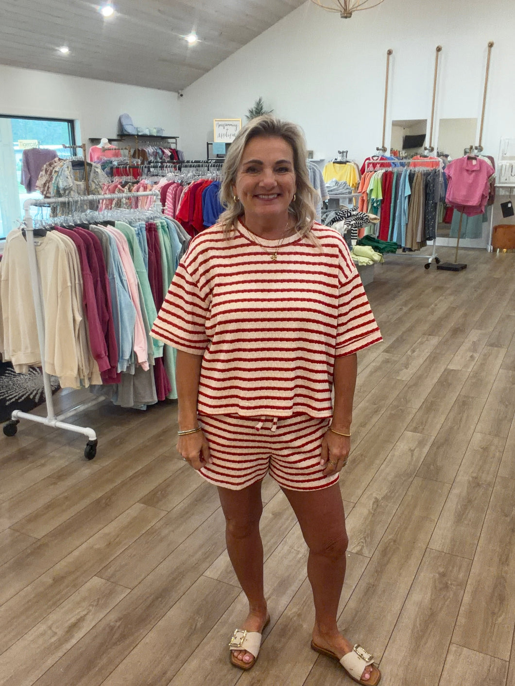 Stripes meet texture in this playful short set that's ready for anything. The mixed fabric creates visual interest while keeping things comfortable and casual. Mix-and-match potential with your favorite basics makes this a versatile wardrobe essential that works harder than it looks.