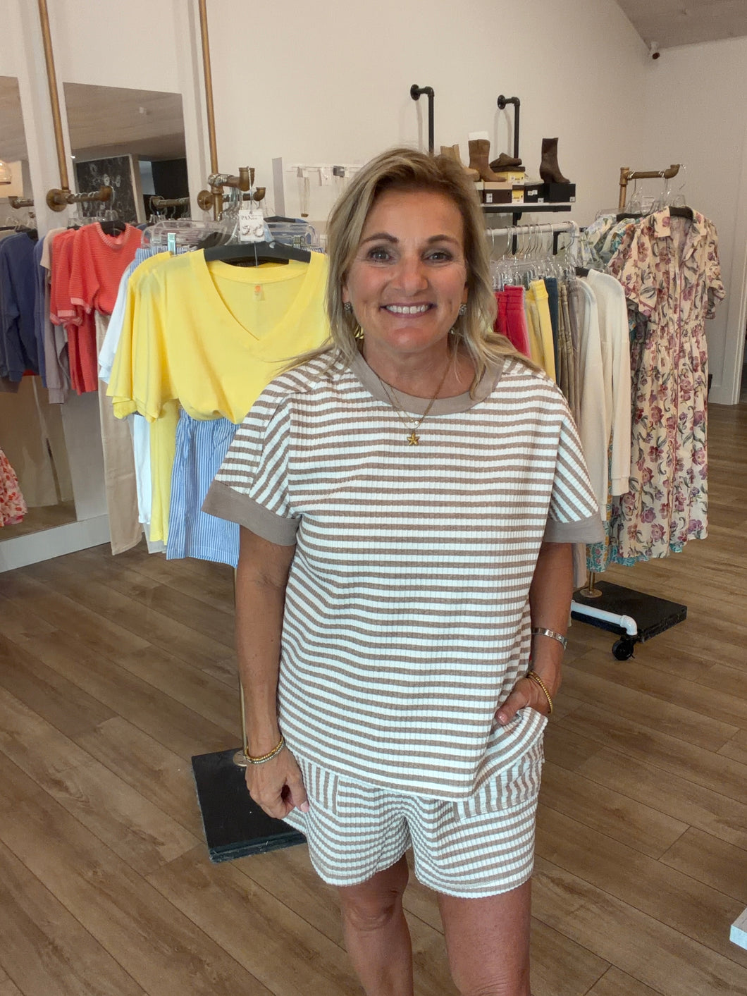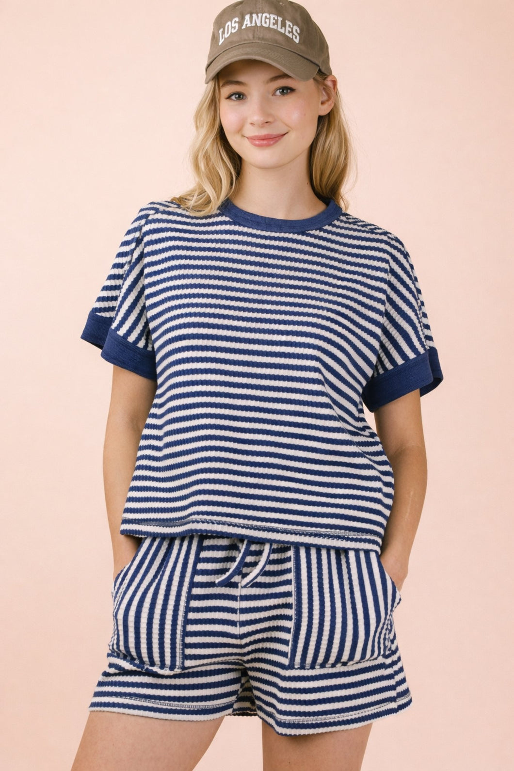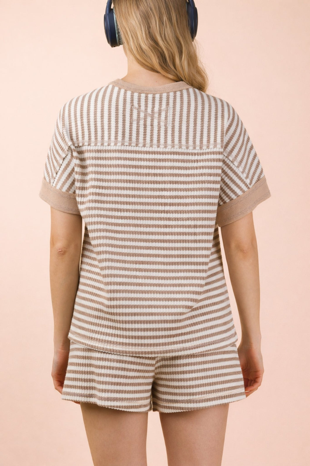 Effortless comfort meets casual style with this striped knit set. The soft, breathable fabric drapes beautifully while the coordinated top and shorts create a put-together look without the effort. Perfect for lounging at home, running errands, or relaxed weekend outings. The classic stripe pattern pairs with neutral tones for versatile styling that works year-round.