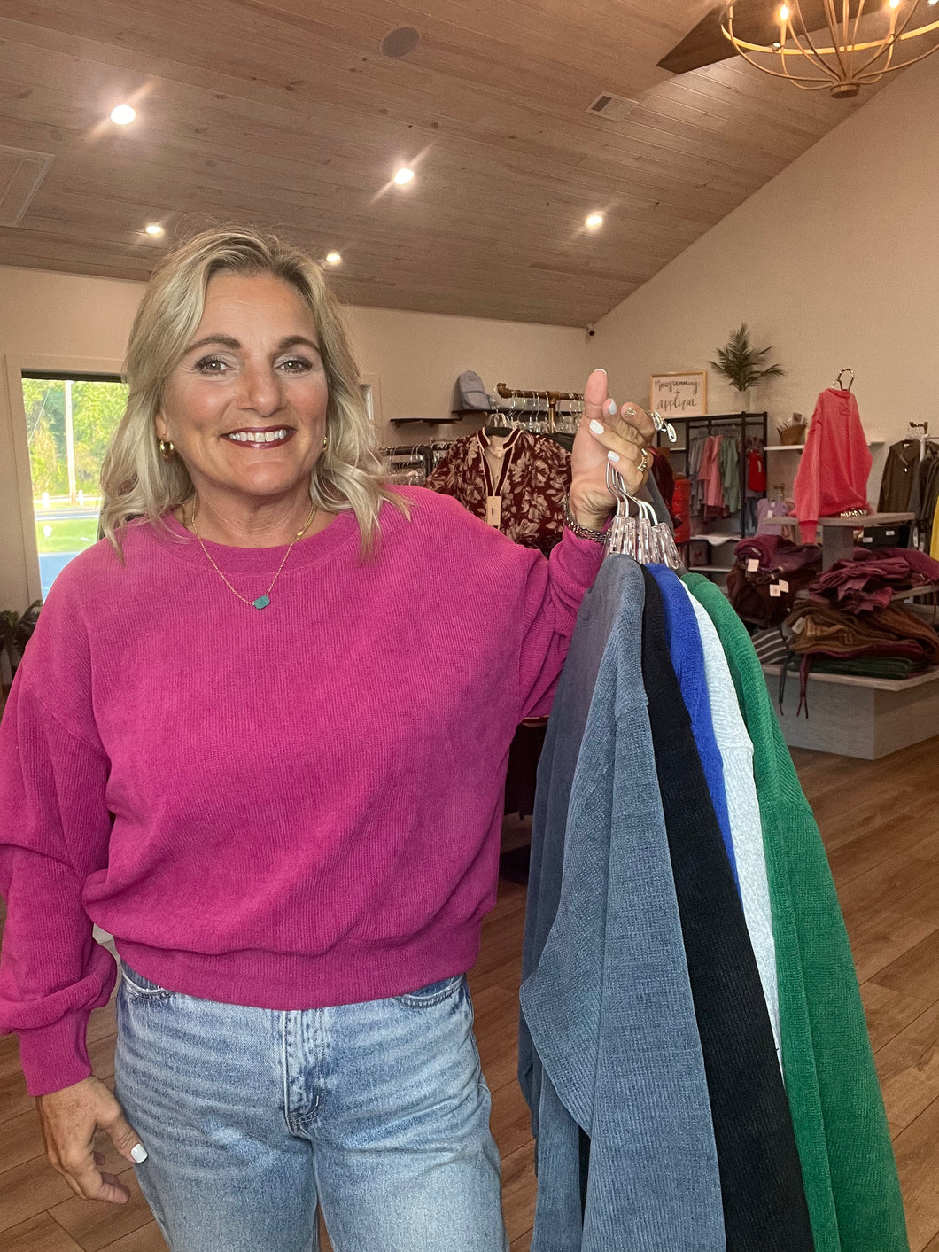 A relaxed-fit long sleeve top in soft brushed cord fabric, with stretch. Dropped shoulders, long sleeves and ribbing at the cuffs. Curved hem with a slightly longer back