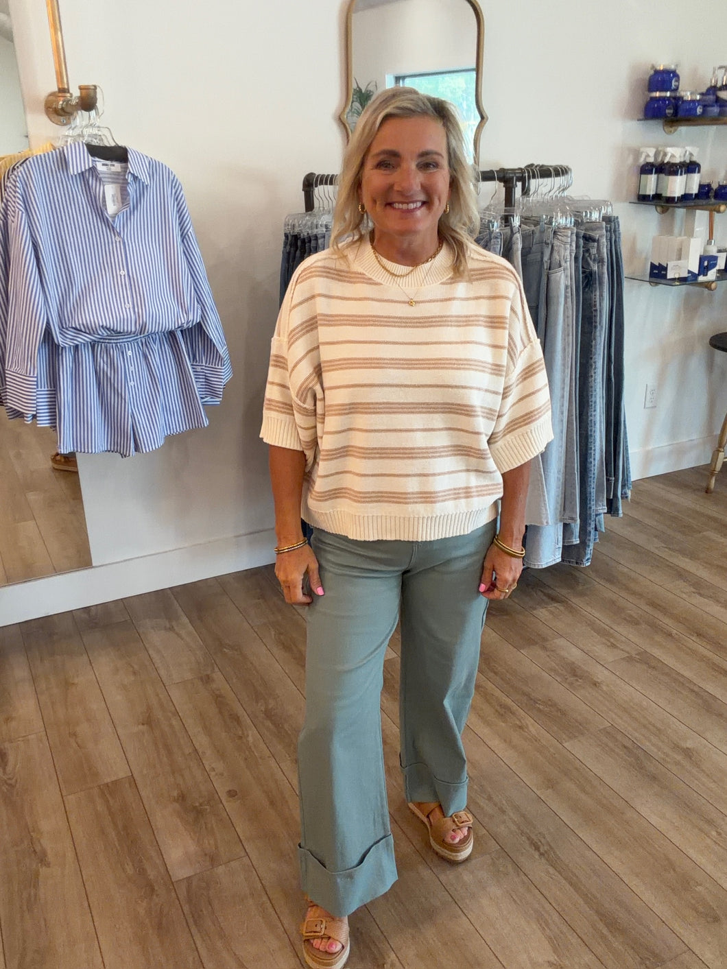 Effortlessly chic and wonderfully versatile, this drop half sleeve sweater top brings a touch of timeless elegance to your everyday wardrobe. The soft striped knit pattern adds visual interest while the relaxed round neckline keeps things casual and approachable. Perfect for layering or wearing solo, the gently dropped sleeves create a flattering silhouette that works beautifully with everything from jeans to skirts. Cozy, comfortable, and endlessly stylish—your new go-to piece awaits.