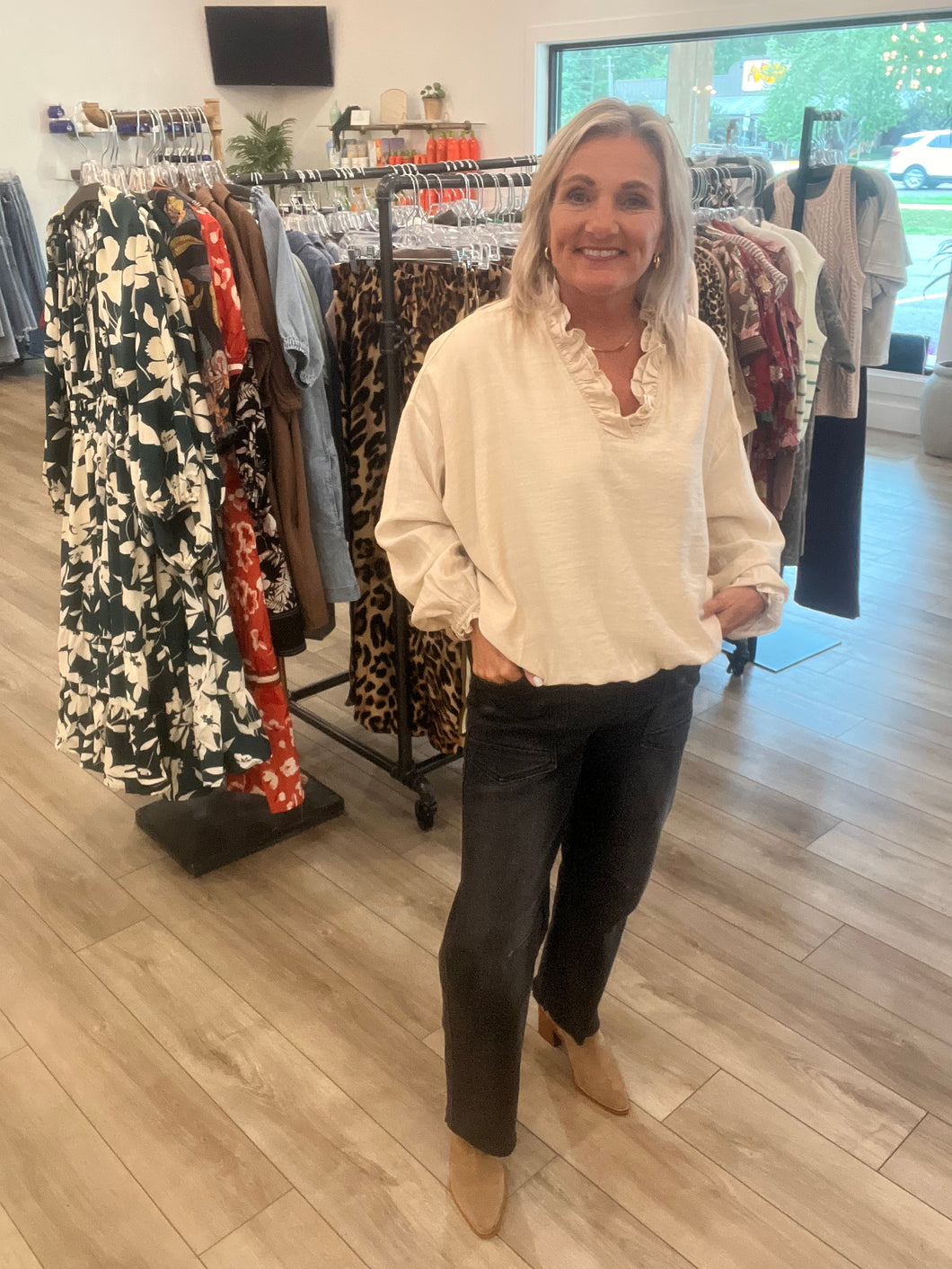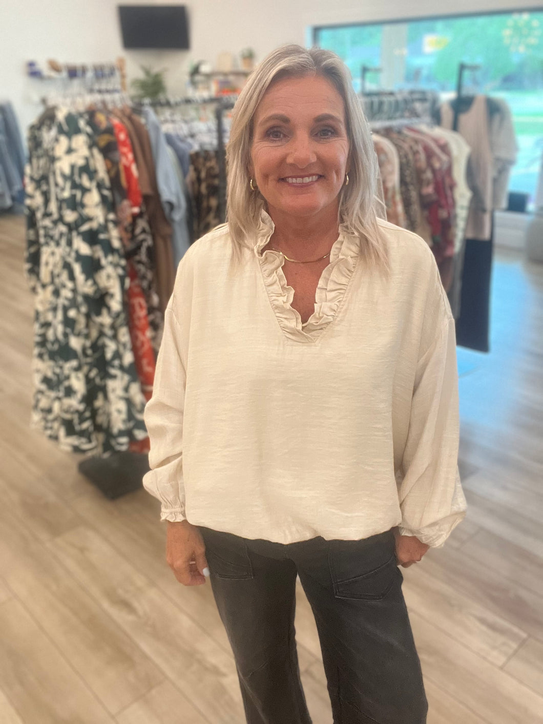 Enjoy effortless charm with the French Vanilla bubble hem gauze top, featuring a playful ruffle detail along the V-neckline. Its lightweight, airy fabric keeps you comfortable all day, while the gentle bubble hem adds a flirty touch to your casual look. This top blends cute style with easy wearability.