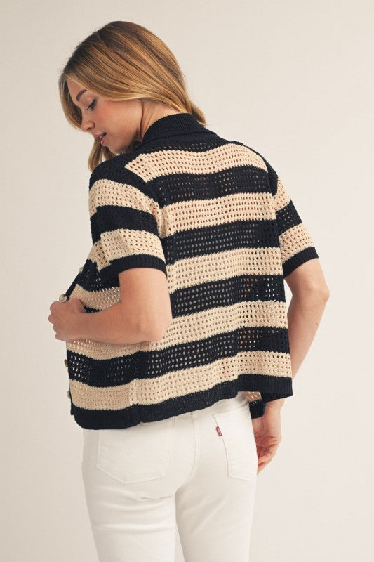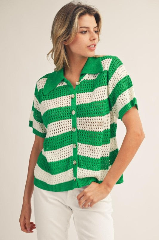Effortless style meets comfort in this lightweight striped sweater top. Featuring a classic collared neckline and convenient button-down front, it's perfect for layering or wearing solo. The soft knit fabric drapes beautifully while keeping you cool, making it an ideal piece for transitional weather or casual everyday wear.