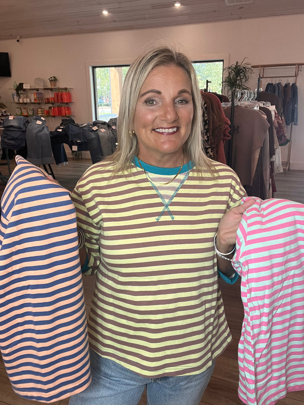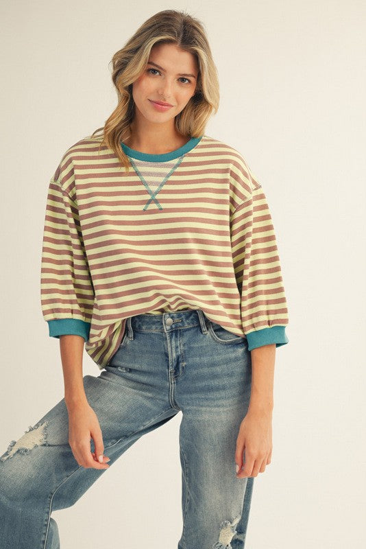 This casual stripe top features playful 3/4 sleeves and a charming V-notched neckline, adding a touch of whimsy to your everyday look. Crafted from a soft blend of 51% cotton and 49% polyester, it promises comfort and easy care.