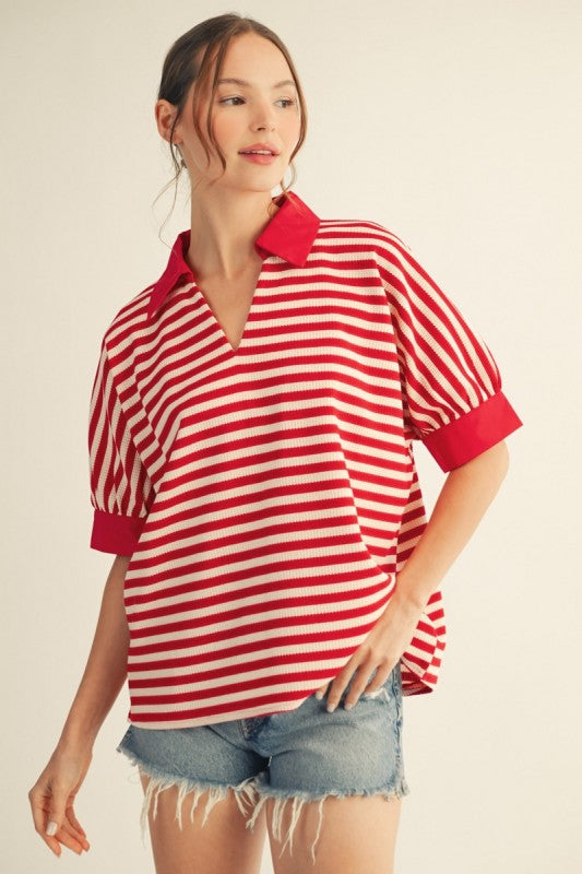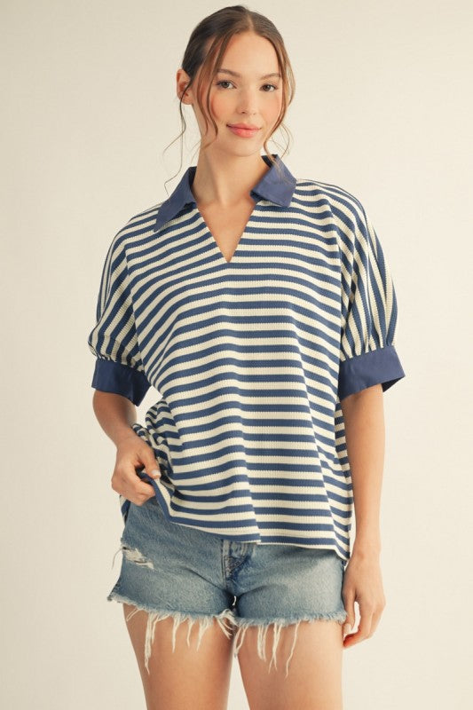 This striped v-neck top combines sporty style with practical details. Short sleeves feature button accents, while the collared neckline and solid contrast stripes keep the look sharp and polished. Perfect for active days or casual wear.