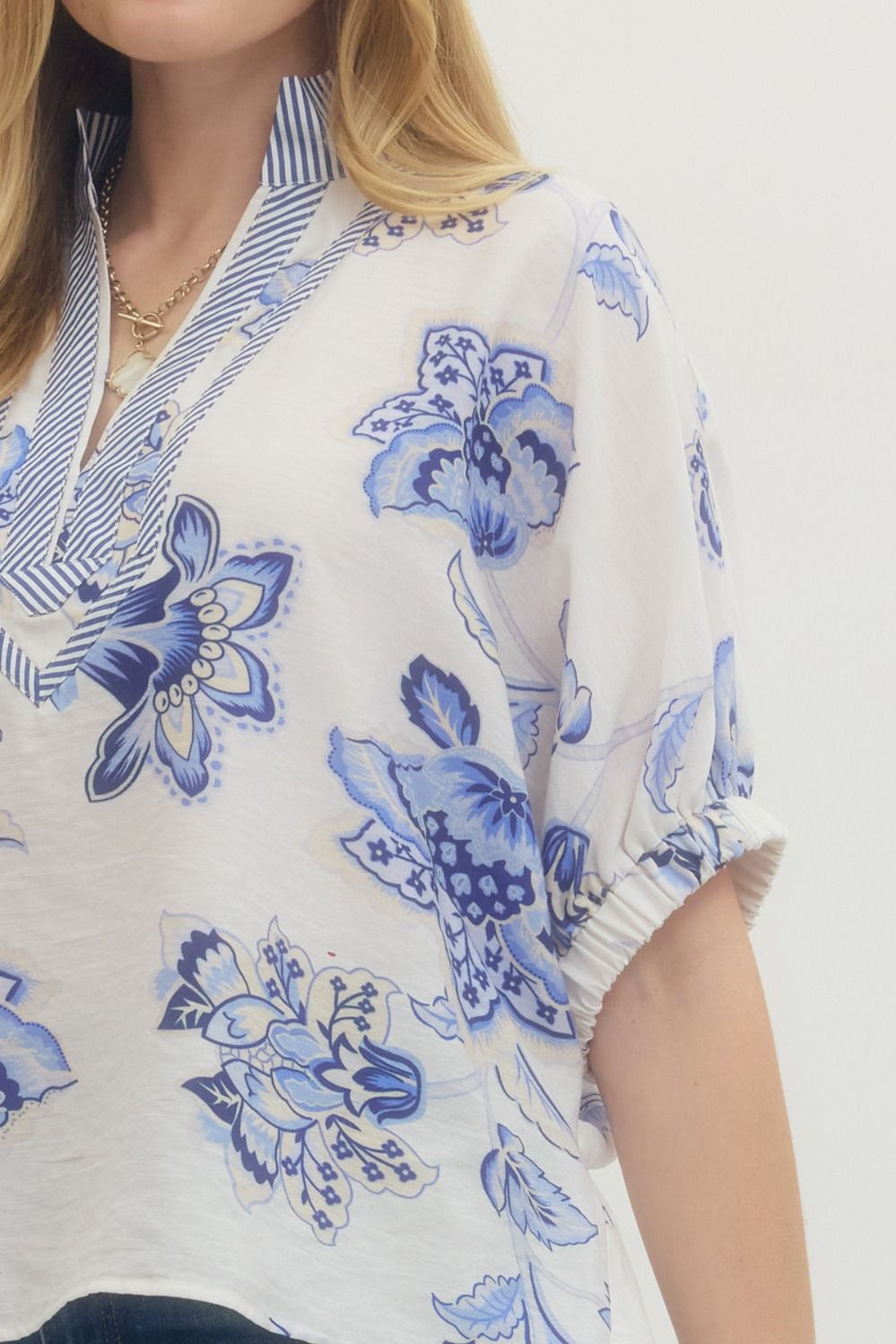 The relaxed dolman sleeves create a flattering silhouette, while the contrast striped band collar adds a playful touch to the classic V-neckline. Elasticated sleeve openings ensure a comfortable, tailored fit that moves with you. Perfect for layering or wearing solo, this versatile piece transitions seamlessly from casual days to weekend gatherings. A fresh wardrobe essential that captures the spirit of spring.
