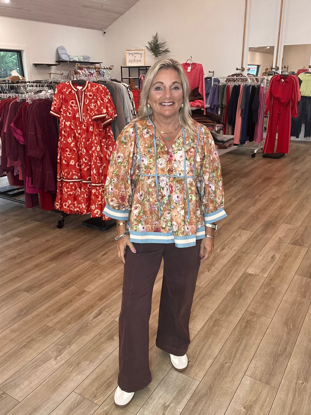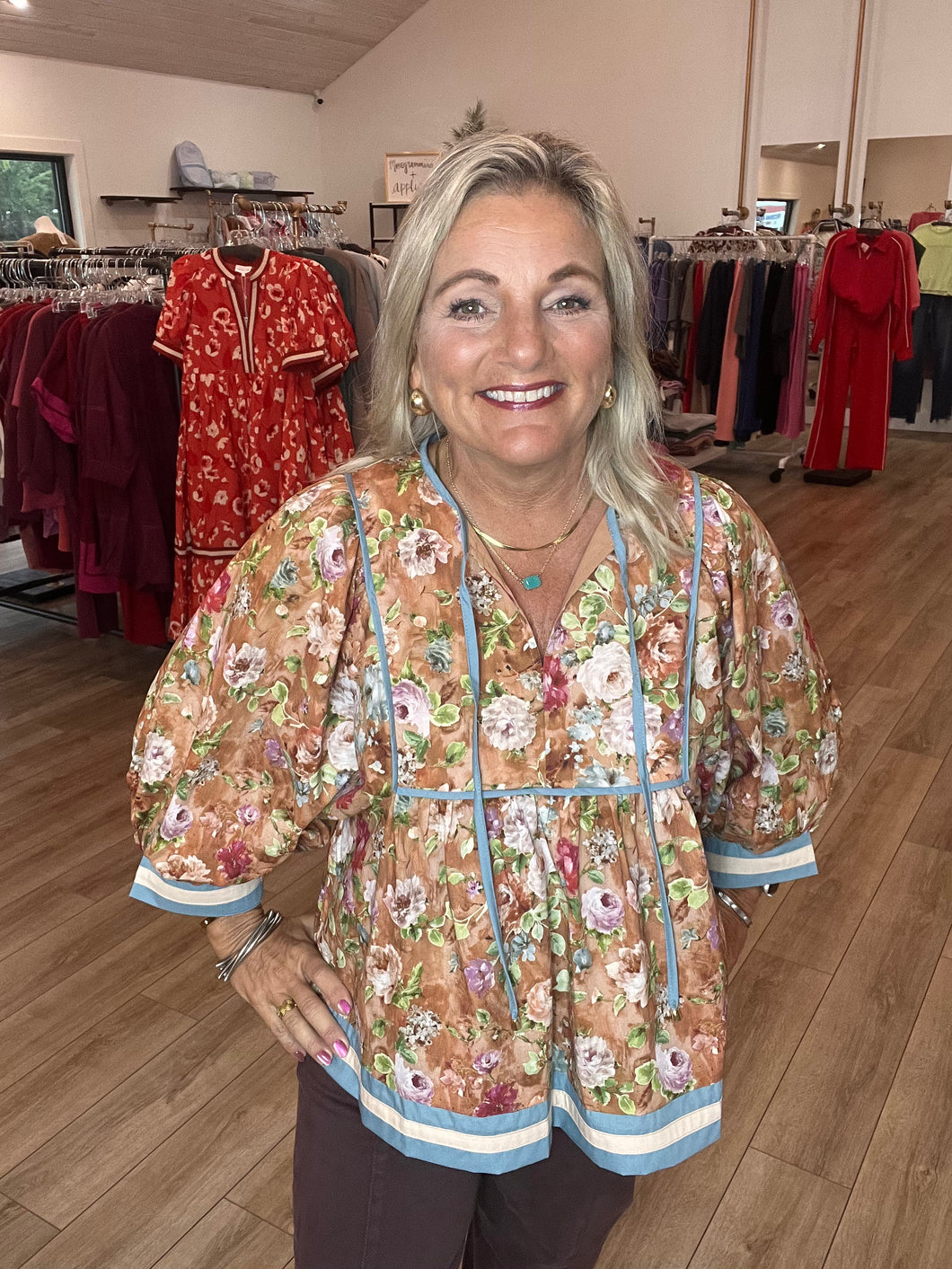 Vintage floral pattern ¾ sleeve empire waist loose top featuring multicolor accent band. Unlined. Woven.