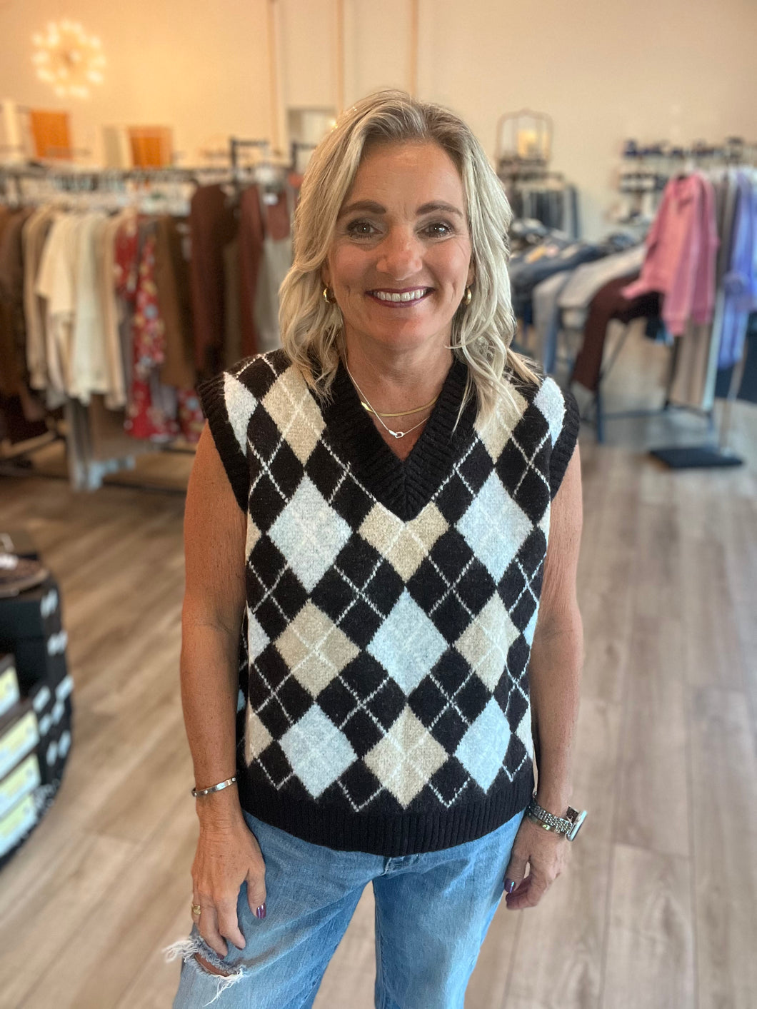 This adorable argyle V-neck sweater vest adds a charming touch to any outfit. Its classic diamond pattern pairs perfectly with a simple blouse or t-shirt, making it easy to create a cozy yet stylish look. Soft and lightweight, this vest keeps you comfortable while adding a sweet, playful vibe to your wardrobe.