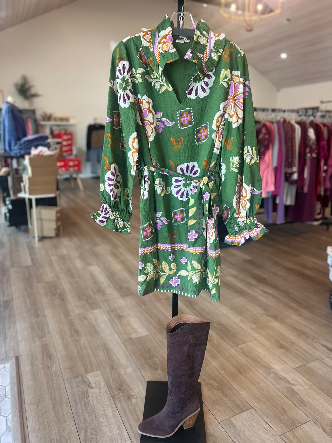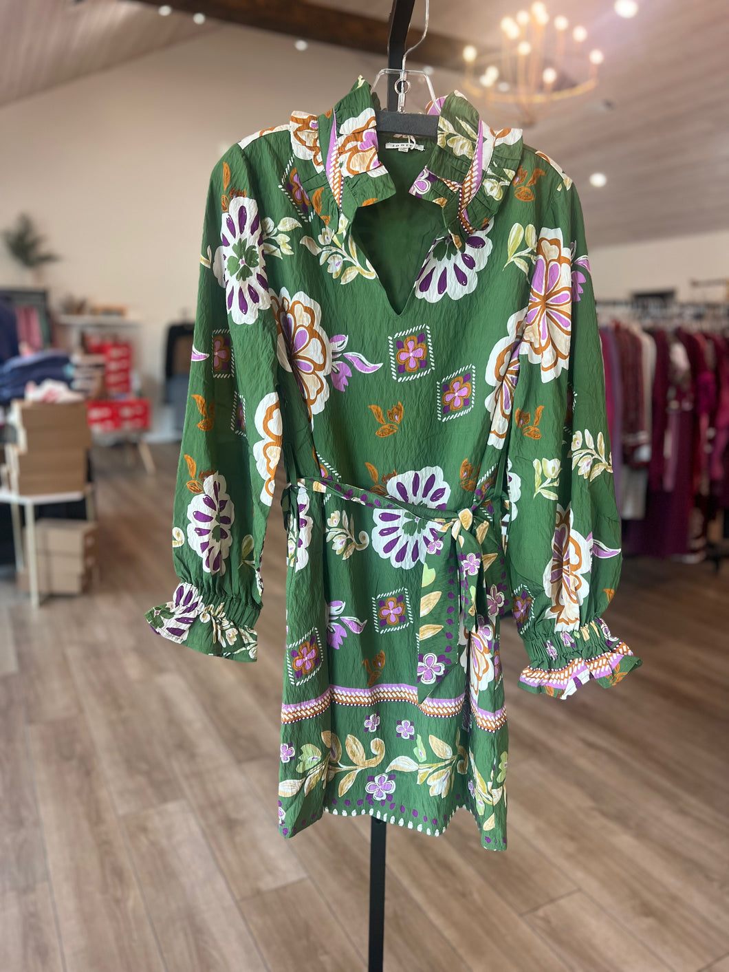 Step into effortless charm with this long-sleeve boho floral dress featuring a playful waist tie to accentuate your silhouette. The ruffled neckline adds flirty detail, while the convenient side pockets keep essentials close.