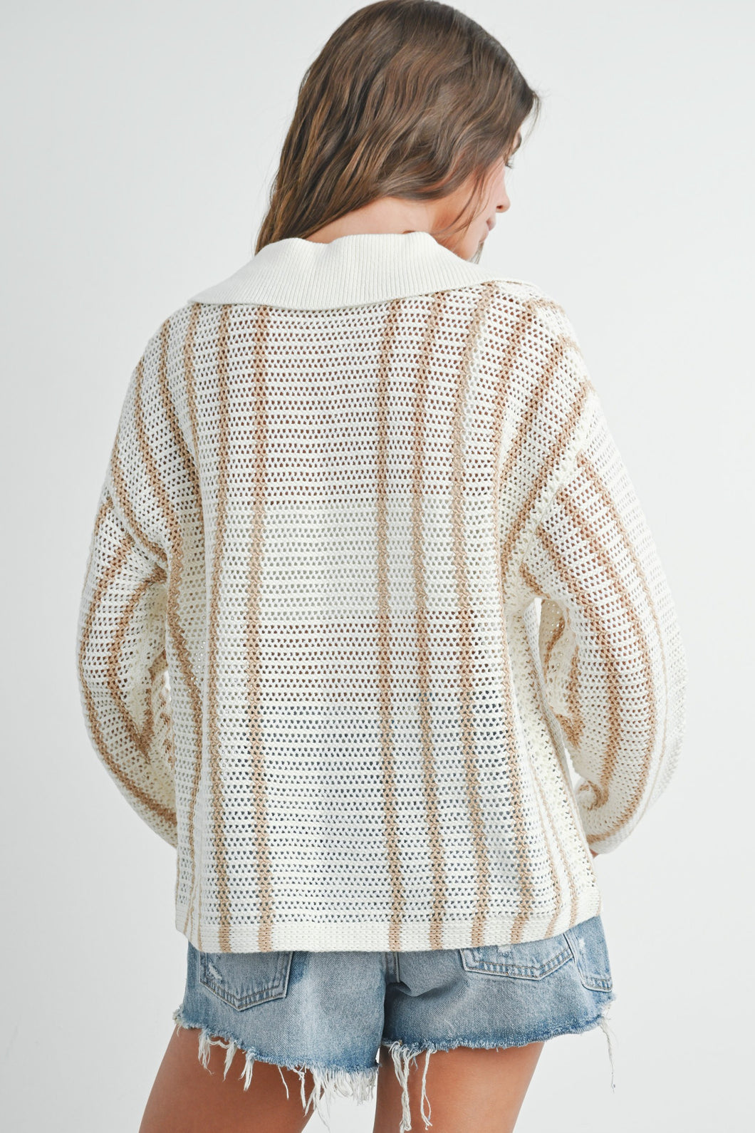 Introducing our Striped Knit Sweater with Collar, a cozy yet stylish essential for your wardrobe. This sweater features classic stripes in a timeless design, adding a touch of sophistication to your look. With its soft knit fabric and comfortable collar, it's perfect for keeping you warm and stylish on chilly days. Pair it with your favorite jeans for a casual yet put-together ensemble, or layer it over a button-down shirt for a preppy vibe. Versatile and easy to style, this striped knit sweater is a must-have addition to any closet.