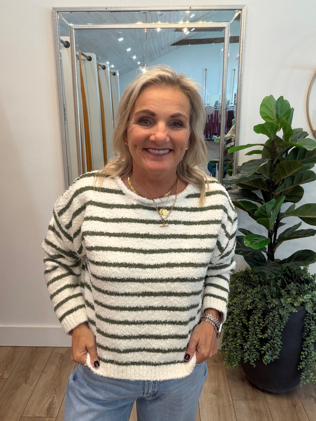 This classic piece features a comfortable and soft knit fabric, ensuring warmth and coziness on chilly days. The subtle striped pattern adds a touch of elegance, making it versatile for both casual and semi-formal occasions. With a relaxed fit and durable construction, this sweater is perfect for layering or wearing on its own.