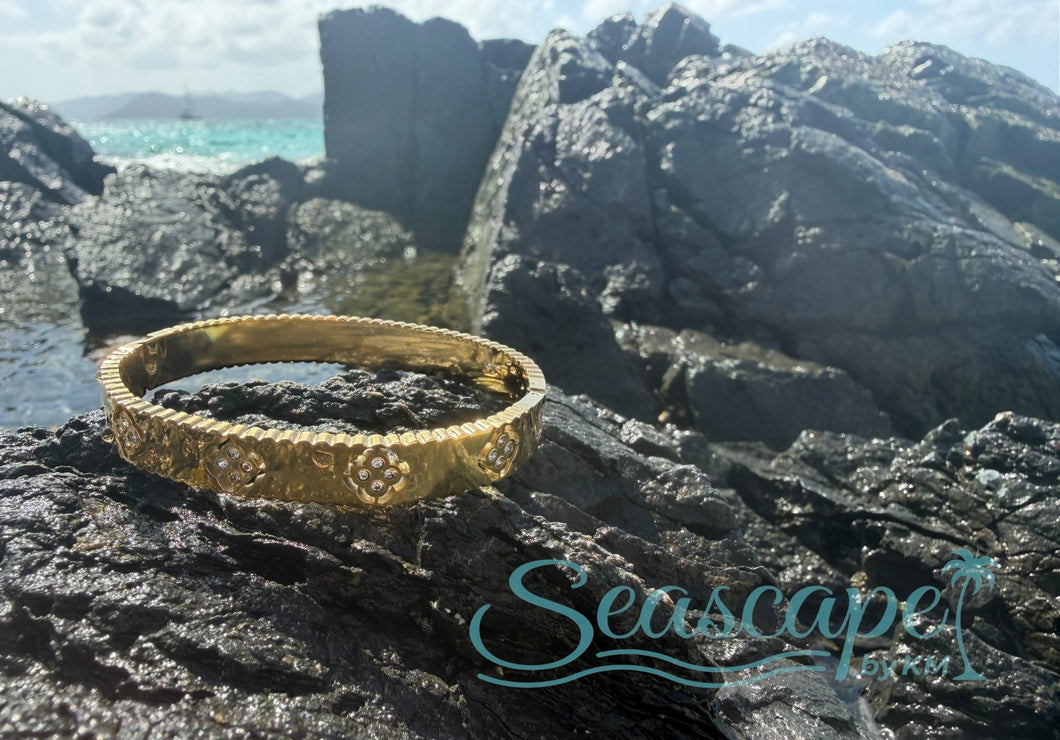 A classic bangle bracelet with a delicate clover detail. The hinged opening makes it easy to put on and take off. Simple and perfect for everyday wear.