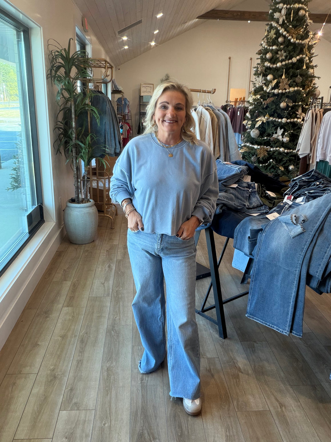 HIGH RISE CLEAN CUT RAW HEM WIDE JEANS COMFORT STRETCH DENIM, HIGH RISE WAIST, CLEAN CUT RAW HEM, FULL LENGTH, WIDE JEANS F. RISE: 10 1/2" / INSEAM: 32" / LEG OPENING: 23" MODEL IS 5'10" WEARING A SIZE 26