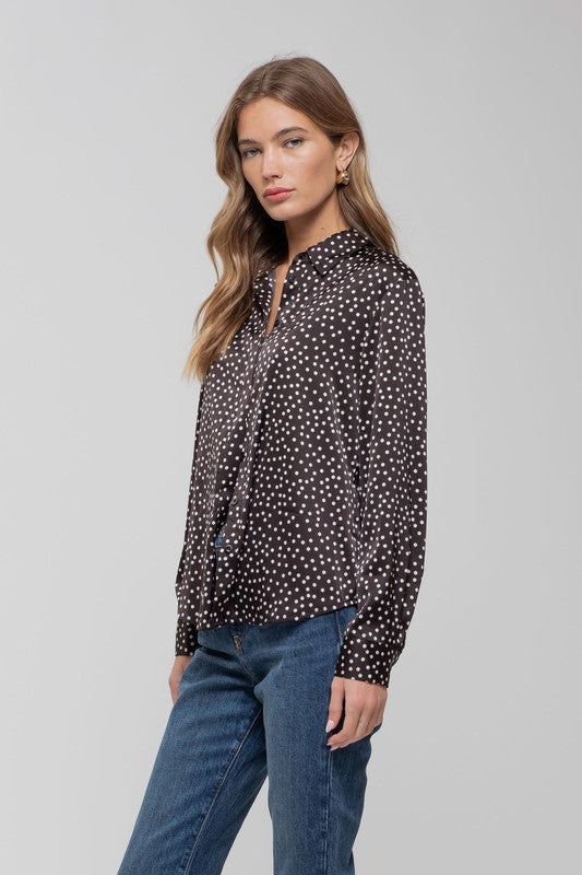 Indulge in luxury with our button up silky blouse. With its delicate small dot pattern, this blouse exudes elegance and sophistication. Perfect for any occasion, this blouse will make you feel like a true fashion icon.  If between sizes, size up on this one.