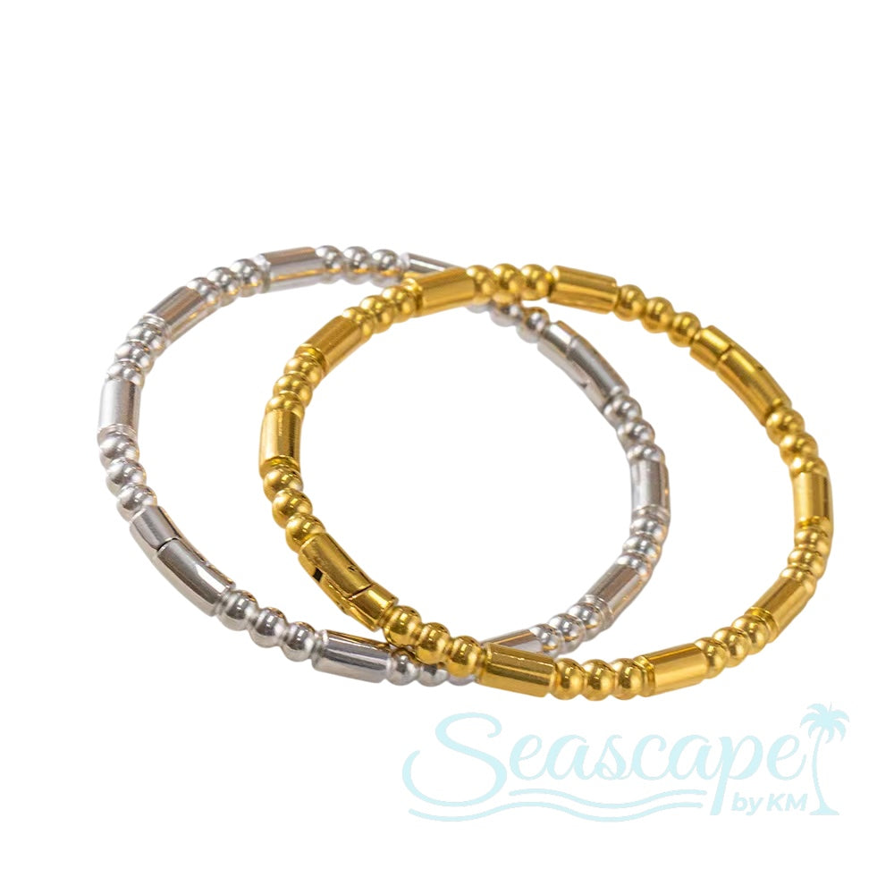 The Maldives Bracelet combines sleek polished surfaces with textured detailing for a modern, dimensional look. Its hinged cuff design opens smoothly for effortless fastening and removal. Built with waterproof construction, this bracelet resists salt water, chlorine, and daily moisture—ideal for coastal living, poolside moments, and water-based adventures. The mixed-finish aesthetic transitions seamlessly from casual to refined styling, making it a versatile addition to any jewelry collection.