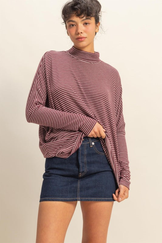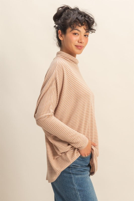 This oversized striped turtleneck top strikes the perfect balance between comfort and effortless style. Ideal for casual outings, its draped silhouette and soft fabric ensures ease of movement. Pair it with skinny jeans or leggings for an ensemble that's both stylish and practical. A versatile piece, it's suitable for layering during cooler months or wearing solo in milder weather.