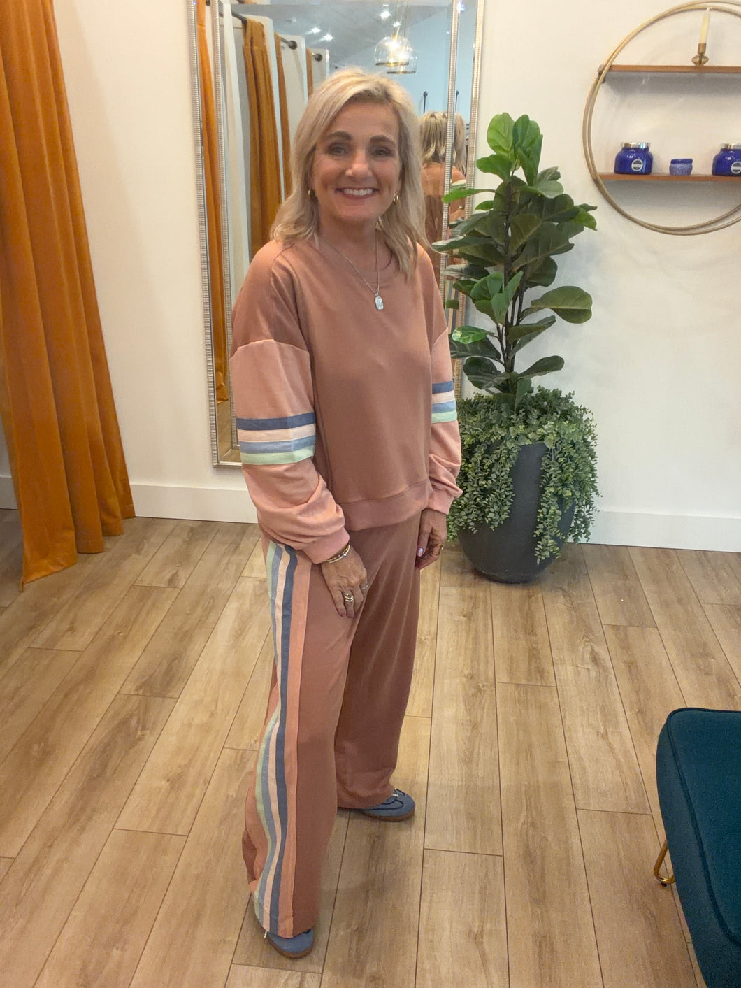 This set brings playful color blocking and casual comfort together. The oversized top features a relaxed drop shoulder, long sleeves, and a round neck with a ribbed hem for a snug finish. The pants offer an elastic waist with a drawstring and wide legs, ensuring easy movement while staying cute and comfy all day long. Perfect for lounging or casual outings with a touch of fun style.