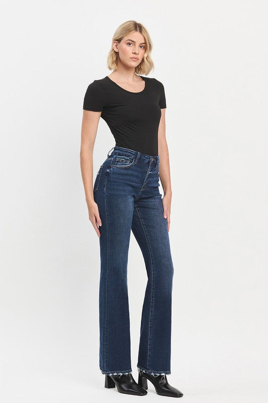 HIGH RISE DARK WASH RELAXED FLARE JEANS COMFORT STRETCH DENIM, HIGH RISE WAIST, 5 POCKETS, LIGHTLY DISTRESSED DETAIL, FULL LENGTH, DARK WASH, RELAXED FLARE JEANS F. RISE: 10" / INSEAM: 34" / LEG OPENING: 20"