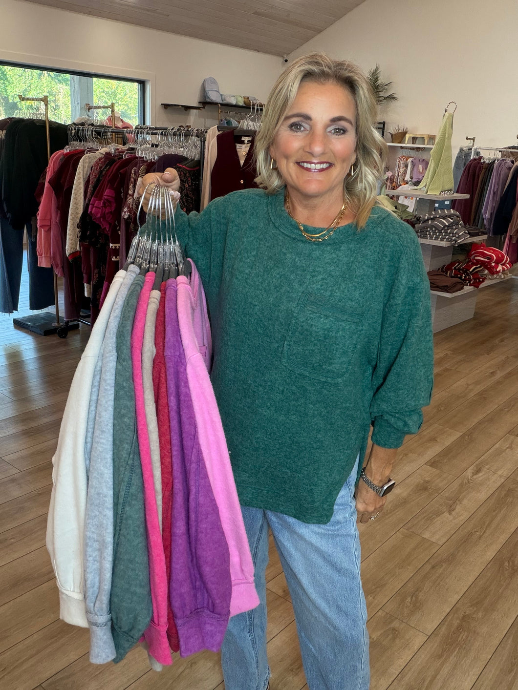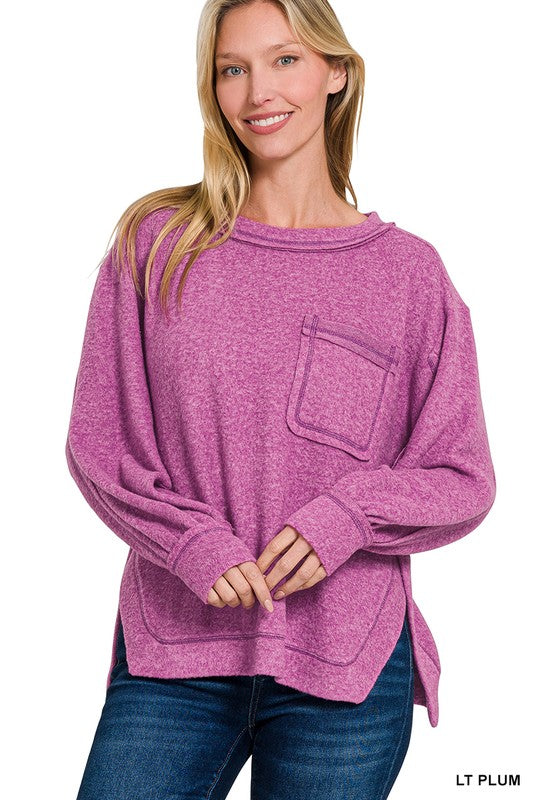 Experience cozy comfort with this brushed hacci sweater featuring a relaxed round neck and a stylish hi-low hem. Side slits add ease of movement and a casual flair, making it perfect for everyday wear. Soft and breathable, it’s your go-to piece for laid-back days with a touch of effortless style.
