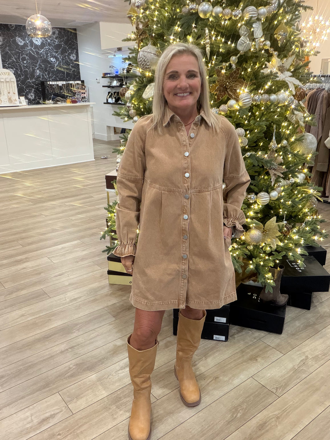 The Riley is your go-to denim dress for effortless style. This charming camel-toned piece features a classic button-front design that's perfect for layering or wearing solo. The timeless denim fabric offers durability and comfort, while the warm neutral shade pairs beautifully with everything in your closet.