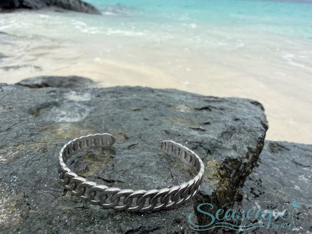 This cuff bracelet features a fashionable stainless steel solid metallic flat curb chain style. Unveil a new dimension of sophistication as this cuff bracelet effortlessly enhances the elegance of your ensemble.