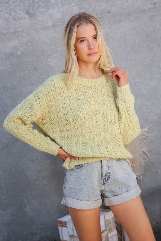 Cozy meets chic in this soft textured knit sweater, designed with a delicate open-knit pattern for a timeless and feminine feel. The relaxed silhouette and ribbed hem and cuffs create an effortlessly flattering shape, while the buttery pastel yellow hue adds a fresh touch to your everyday wardrobe.
